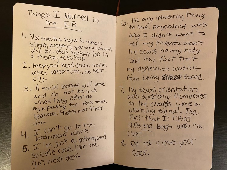 Looking back on that journal, I found one poem I had written that stood out to me in a particular way. The scribbled, messy, and unorganized ink staring at me from the pages brought nostalgia in the most unprecedented ways. Part of me is surprised I had the courage to put it down on paper. It is titled “Things I Learned in the ER” and it contains 20 semi-formed thoughts on my night spent at the hospital as a teen suicide patient. Part of me is so scared to say that, knowing it will cast shadows of stereotypes around me. The main thing is this: I don’t want to be judged on who I was. I want to be seen for who I am now; this person of personal growth and someone who has strength within themself because of what they went through. “Your wound is not your fault, but your healing is your responsibility,” -JetpackJay (YouTube). It’s not my fault that I went through what I did- there were many factors that led up to that experience and the months after it. At the same time, choosing to heal and get better was my responsibility and over time I took it upon myself to take that next step: to try and get better.