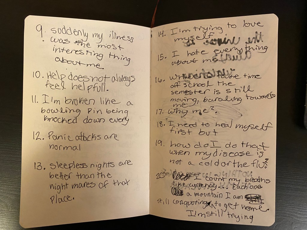 So, I am going to open up a bit and become vulnerable about that experience, sharing that poem with you today. While I feel it is better spoken aloud as slam poetry is meant to be, I am only going to share the journal pages with you today because I do, indeed, lack the energy to create a video, and I think that’s okay. When reading, I advise you to state the numbers aloud as they are important in the telling of this story and the incompleteness of some thoughts. I am opening up about my experiences and that’s something I feel I should be proud about.