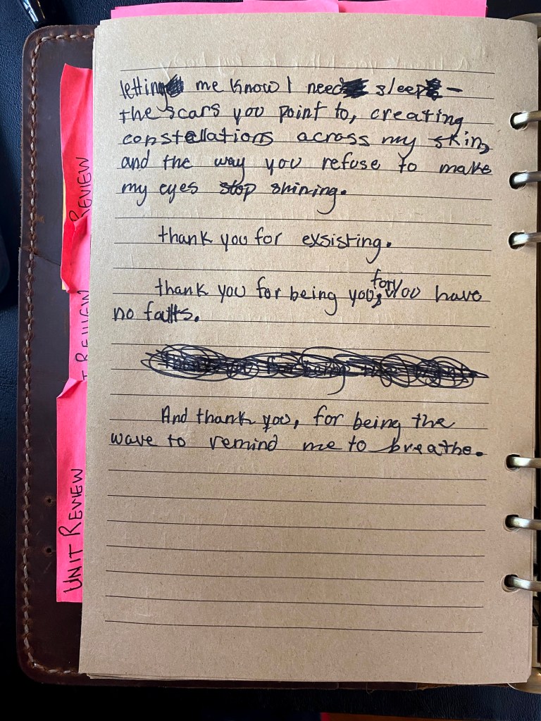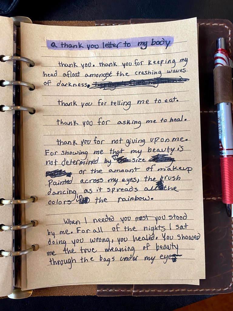 My therapist gave me these journal prompts- most of which were cheesy and predictable, but I somehow found one that I thought was worth the effort. The result was more of a poem than a journal entry, in my eyes at least. I figured now is the perfect time for some self-reflection and something positive as well. So, here are the journal pages of the poem I wrote titled “a thank you letter to my body”