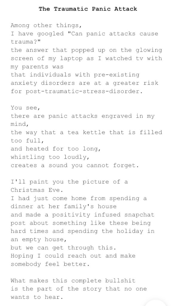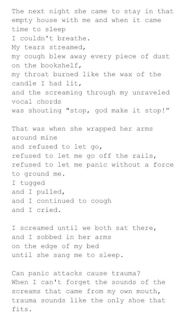 I wrote a poem about that night because it is the one single way that I know how to express that much emotion. The poem I wrote about that night is called “The Traumatic Panic Attack” and I’d like to share it in hopes of communicating in a way that only art can…